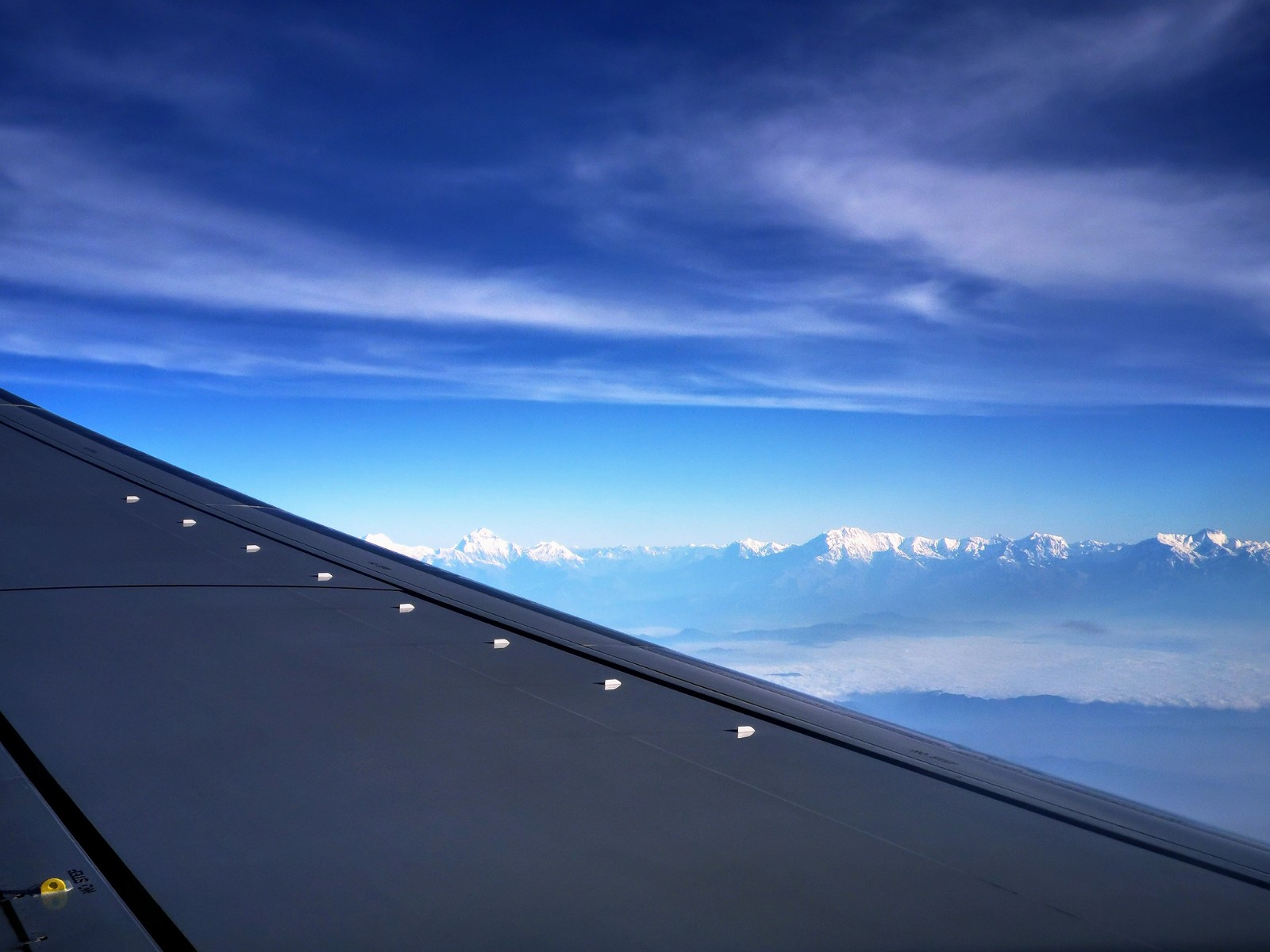 Tuż przed lądowaniem podziwialiśmy ośmiotysięczniki Dhaulagiri (z lewej) oraz ogromny masyw Annapurny (z prawej).